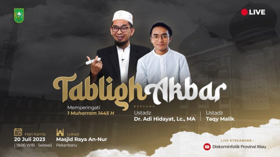 Pekanbarukini.com (PEKANBARU) – Dalam rangka memperingati tahun baru islam 1 Muharram 1445 Hijriah tanggal 19 Juli 2023, Pemerintah Provinsi (Pemprov) Riau akan menggelar Tablig Akbar dengan mengundang penceramah kondang Ustadz Dr Adi Hidayat Lc MA atau yang akrap disapa UAH ke Riau.