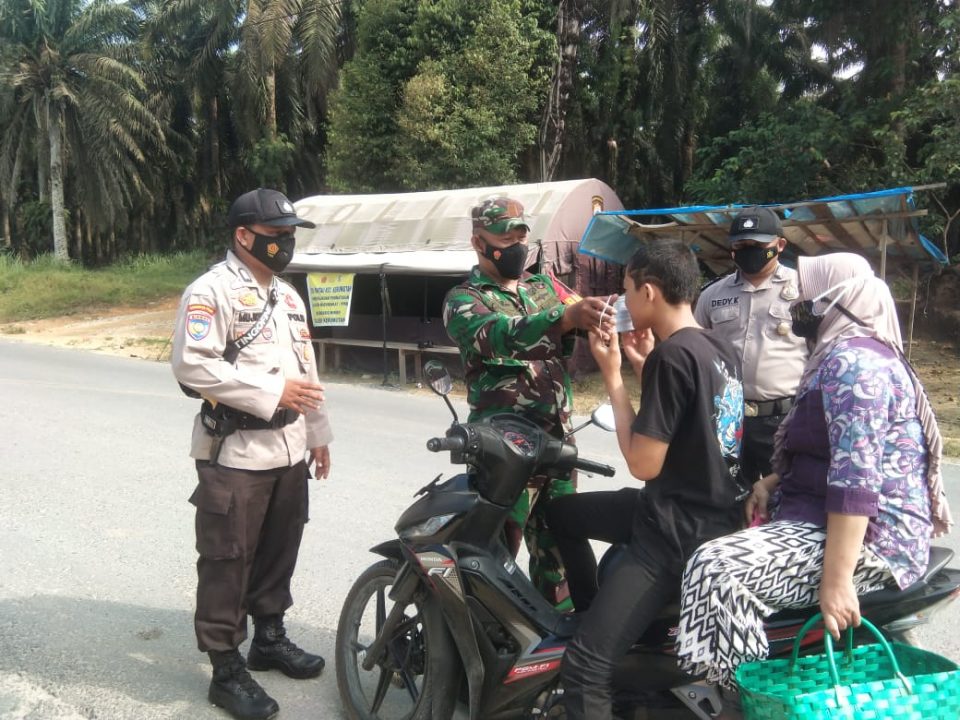 Pekanbarukini.com (PELALAWAN) – Jajaran Bhabinkamtibmas Polsek Kerumutan bersama Babinsa menghimbau Protokol kesehatan (Prokes) masyarakat serta membagikan masker gratis bagi masyarakat yang melintas di sekitar pos pembatasan pemberlakuan kegiatan masyarakat (PPKM), Sabtu (11/9/2021).