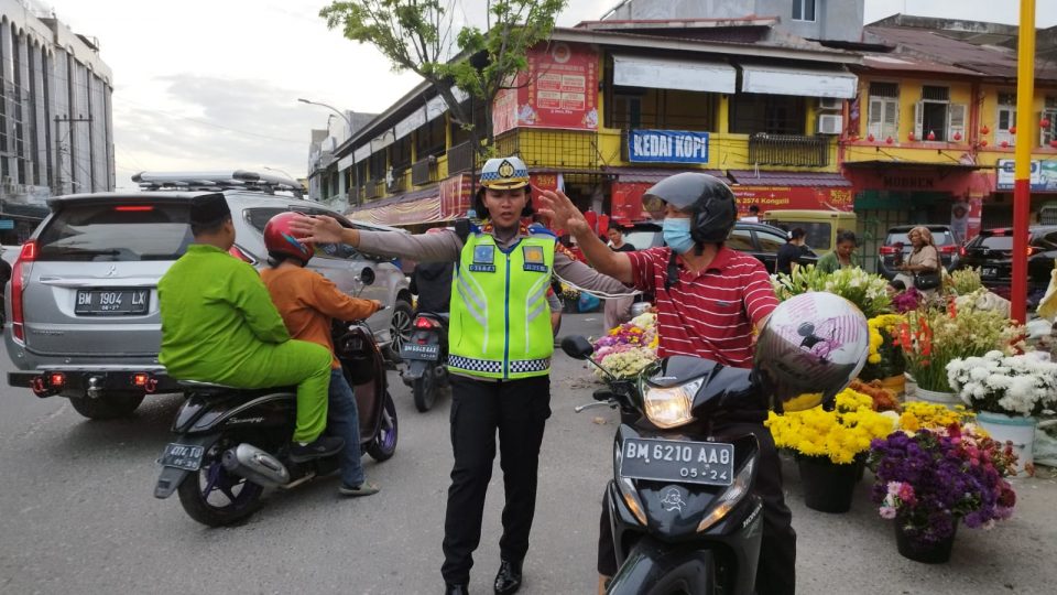 Pengaturan lalu lintas di pusat perbelanjaan pernak pernik Imlek Pasar Sago di Jalan Juanda, Jumat (20/1) dipimpin langsung oleh di Kasat Lantas Polresta Pekanbaru Kompol Birgitta Atvina Wijayanti.