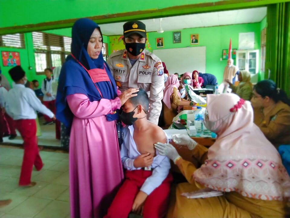 Pekanbarukini.com (PELALAWAN) – Kepolisian Sektor Ukui, jajaran Polres Pelalawan bantu upaya percepatan vaksinasi anak usia 6-11 tahun dengan melakukan jemput bola ke sekolah-sekolah.