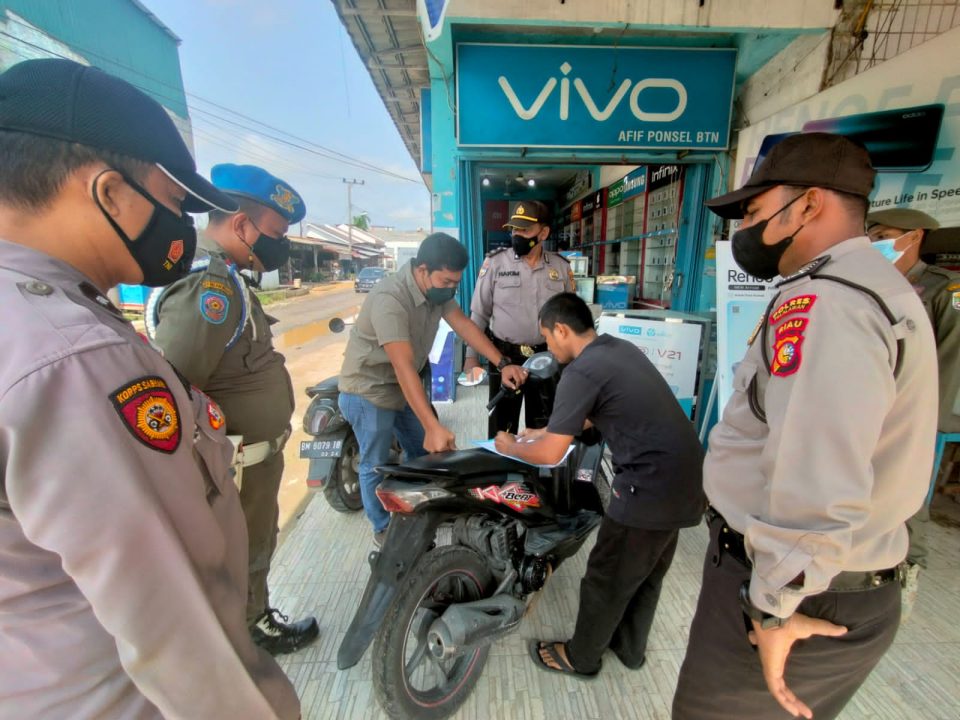 “Kegiatan ini dilaksanakan sesuai Peraturan Bupati Pelalawan nomor 63 tahun 2020 tentang Penerapan disiplin dan penegakan hukum protokol kesehatan sebagai upaya pencegahan dan pengendalian coronavirus disease (Covid-19) di Kabupaten Pelalawan,” ujar Kapolsek Pangkalan Kerinci AKP MY Lubis.