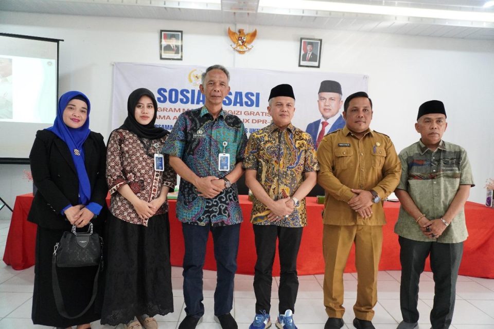 Sosialisasi program MBG di Desa Birandang dimeriahkan oleh anggota Komisi IX DPR RI Sahidin, Tenaga Ahli direktorat promosi dan edukasi gizi BGN Dedi Suprijadi, dan Kepala Desa Birandang Tomas Renaldo.
