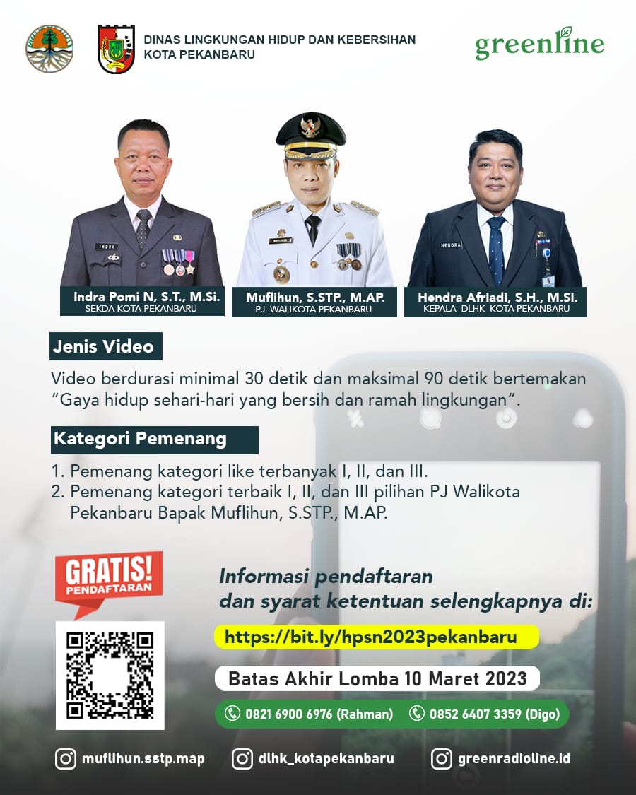 Pekanbarukini.com (PEKANBARU) – Dinas Lingkungan Hidup dan Kebersihan (DLHK) Kota Pekanbaru menggelar lomba pembuatan Video Instagram Green Lifestyle mulai 1 Maret hingga 10 Maret 2023.