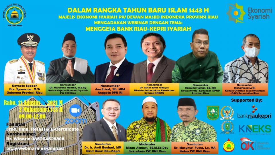 Pekanbarukini.com (PEKANBARU) – Dalam rangka memperingati tahun baru Islam 1443 Hijriyah, Majelis Ekonomi Syariah Pimpinan Wilayah Dewan Masjid Indonesia (MES PW DMI) Provinsi Riau melaksanakan webinar. Tema yang dibahas dalam webinar tersebut yaitu Menggesa Bank Riau Kepri Syariah.