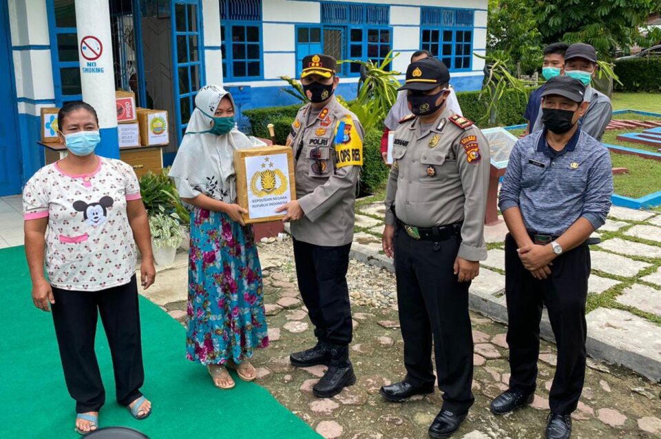 Selanjutnya Kapolres Pelalawan memberikan bingkisan secara simbolis perwakilan masyarakat yang hadir dalam kegiatan vaksinasi.