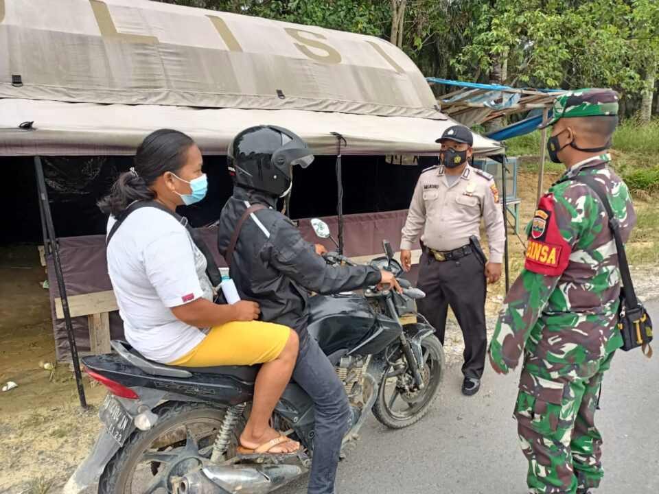 Pekanbarukini.com (PELALAWAN) – Kapolsek Kerumutan Iptu Fajri Sentosa melalui personelnya secara intens menekankan imbauan protokol kesehatan (Prokes) Covid-19 terhadap masyarakatnya, Selasa (26/10/2021).