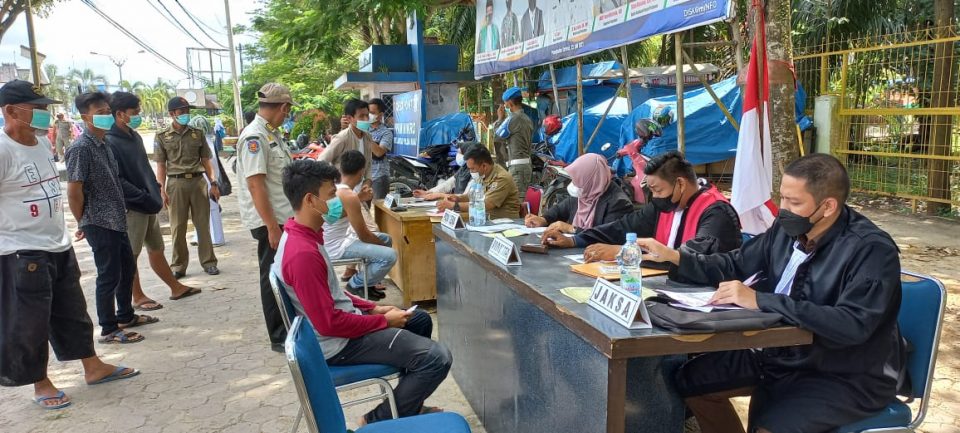 Pekanbarukini.com (PELALAWAN) – Dalam rangka pendisiplinan masyarakat di masa adaptasi kebiasaan baru (AKB), Polsek Pangkalan Kerinci melakukan kegiatan operasi yustisi di wilayah hukumnya (Wilkum), Selasa (10/8/2021). Dalam pelaksanaan tersebut petugas jaring puluhan pelanggar protokol kesehatan (prokes).