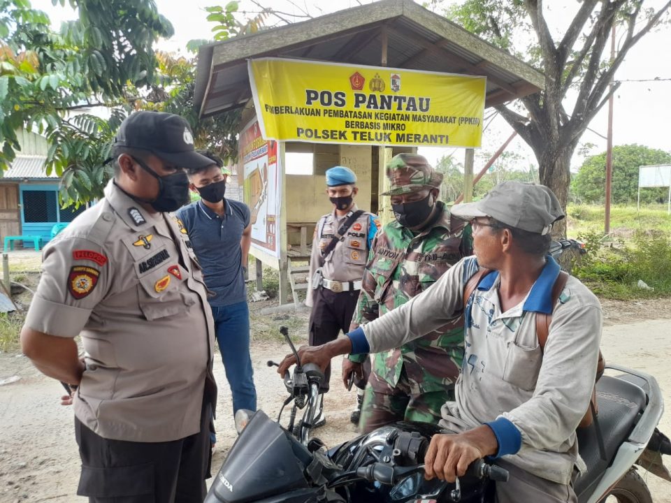 Pekanbarukini.com (PELALAWAN) – Polsek Teluk Meranti bersama TNI melaksanakan sosialisasi protokol kesehatan (prokes) di pos pantau Pemberlakuan Pembatasan Kegiatan Masyarakat (PPKM), Kelurahan Teluk Meranti, Sabtu (19/6/2021). Kegiatan dipimpin oleh Aipda Restu Inanda.