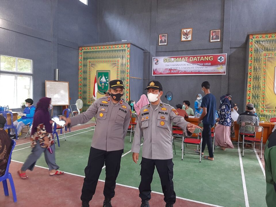 Kepala Kepolisian Sektor Ukui Iptu Tatit Rizkyan Hanafi didampingi Kanit Intel Polsek Ukui Ipda Deddy H.C Tobing meninjau langsung pelaksanaan vaksinasi sekaligus memberikan pengamanan terkait penerapan prokes.