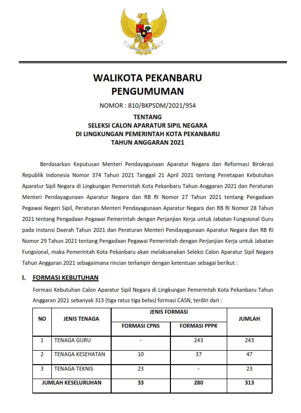 Pekanbarukini.com (PEKANBARU) – Pemerintah Kota Pekanbaru telah merilis pengumuman pemerimaan CPNS pada laman Pekanbaru.go.id, Kamis (1/7/2021). Dalam pengumuman tersebut sebagaimana diketahui ada 313 formasi dalam seleksi CPNS Pemerintah Kota Pekanbaru.