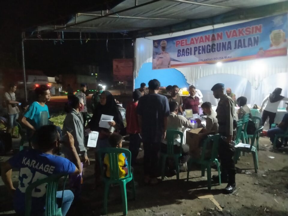 Pekanbarukini.com (PELALAWAN) – Polsek Bandar Sei Kijang dibantu Personil Dit Lantas Polda Riau, Personil sat Brimob Polda Riau dan TNI membuka layanan vaksinasi bagi para pengguna jalan hingga malam hari.