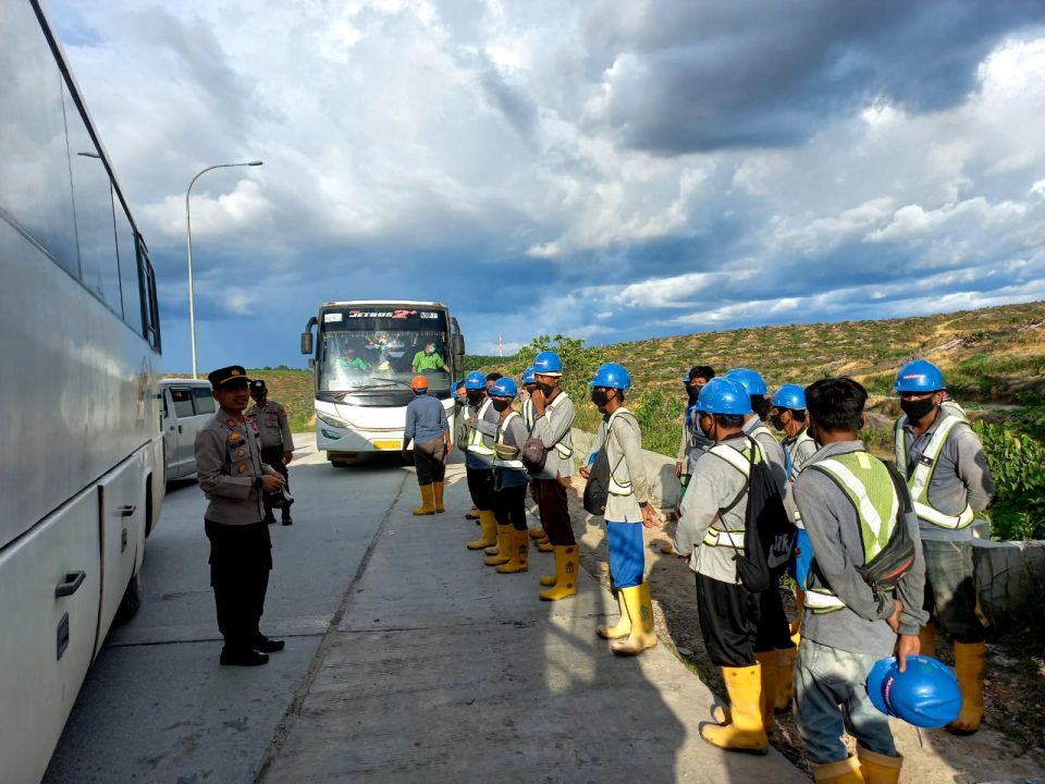 Pekanbarukini.com (PELALAWAN) – Polsek Pangkalan Kerinci, melaksanakan giat penertiban Protokol Kesehatan (Prokes) terhadap bus pembawa karyawan PT. RAPP di Pos 9 Simpang Perak, Pangkalan Kerinci.