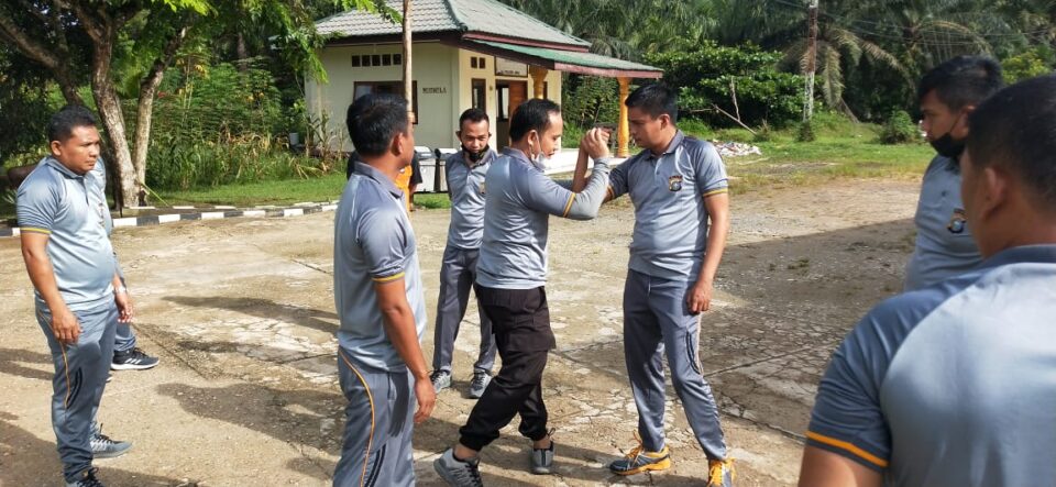 Pekanbarukini.com (PELALAWAN) – Polsek Ukui, jajaran Polres Pelalawan melaksanakan pelatihan bela diri borgol dan tongkat T Polri di halaman apel Polsek Ukui, Jumat (12/11/2021).